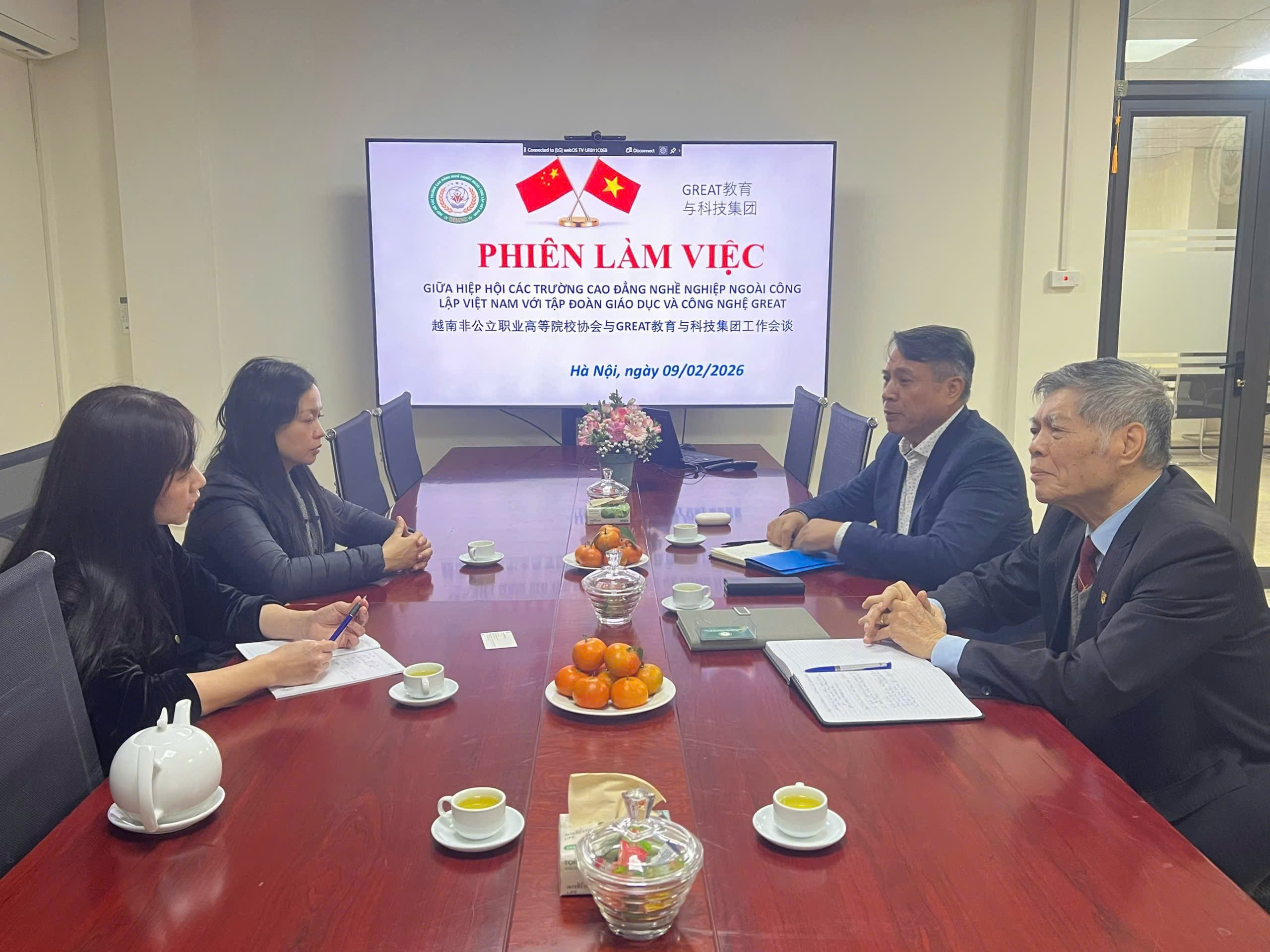 Chiều ngày 09/02/2026, tại Văn phòng Hiệp hội đã diễn ra buổi làm việc với Tập đoàn giáo dục kỹ thuật Great Quảng Tây (Trung Quốc) để hướng tới giáo dục nghề nghiệp, đào tạo lao động chất lượng cao. Thay mặt Hiệp hội, ông Nguyễn Đắc Hưng – Chủ tịch Hiệp hội, ông Tô Xuân Giao – Phó chủ tịch Hiệp hội kiêm Trưởng ban Hợp tác doanh nghiệp và ông Nguyễn Thanh Sơn – Cố vấn Chủ tịch Hiệp hội đã tiếp và làm việc với đối tác. Về phía Tập đoàn Giáo dục kỹ thuật Great Quảng Tây (Trung Quốc) có bà Lục Tuyết Mai – Chủ tịch Tập đoàn Giáo dục kỹ thuật Great Quảng Tây và bà Nguyễn Thị Tuyết – TGĐ phụ trách hợp tác quốc tế của Tập đoàn.
