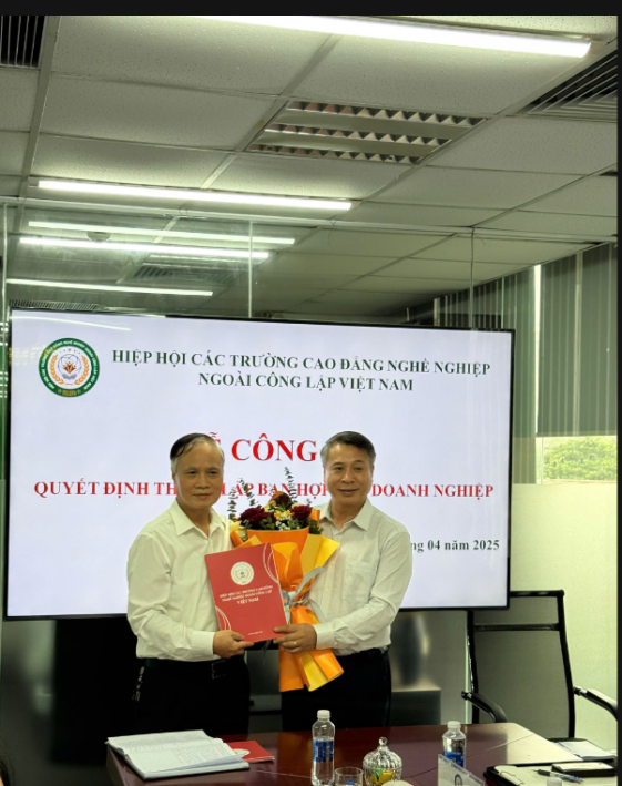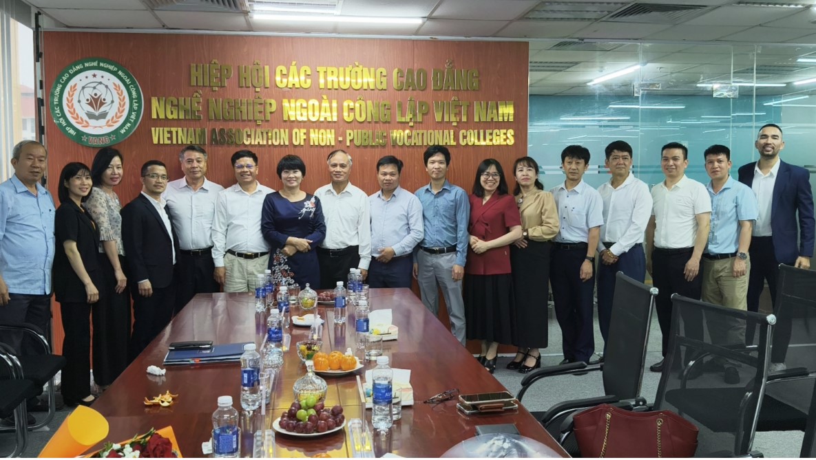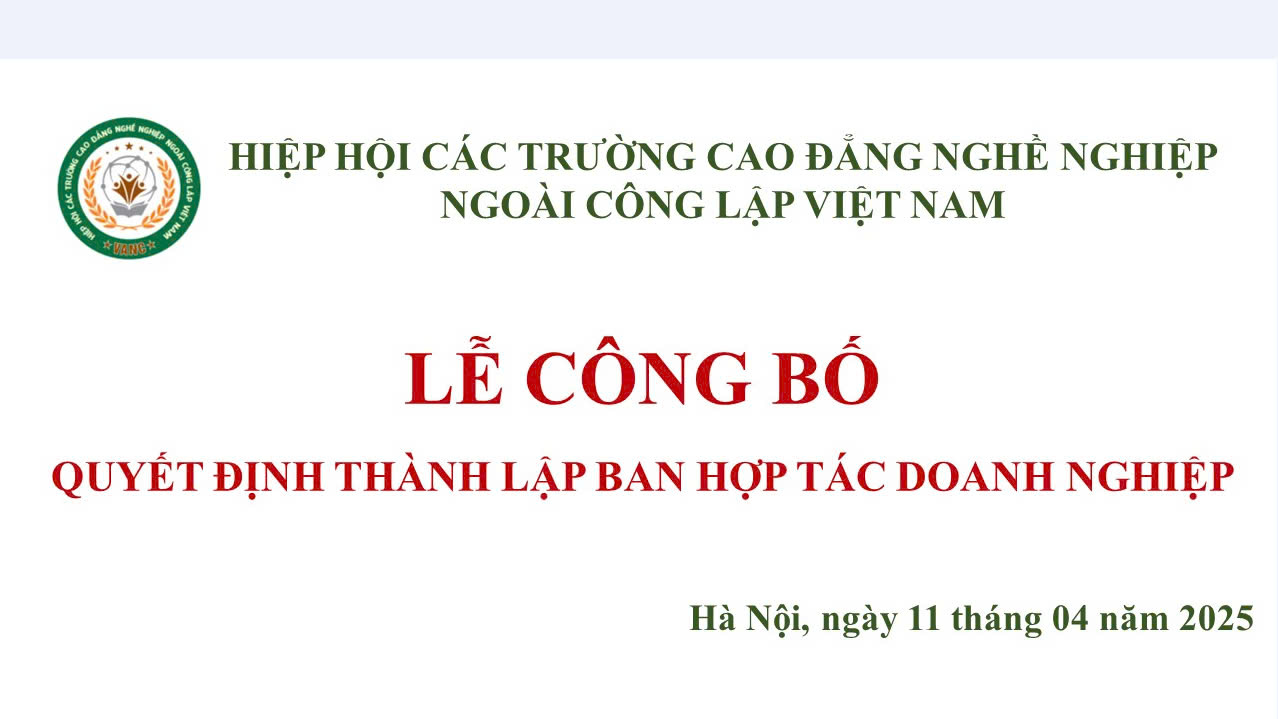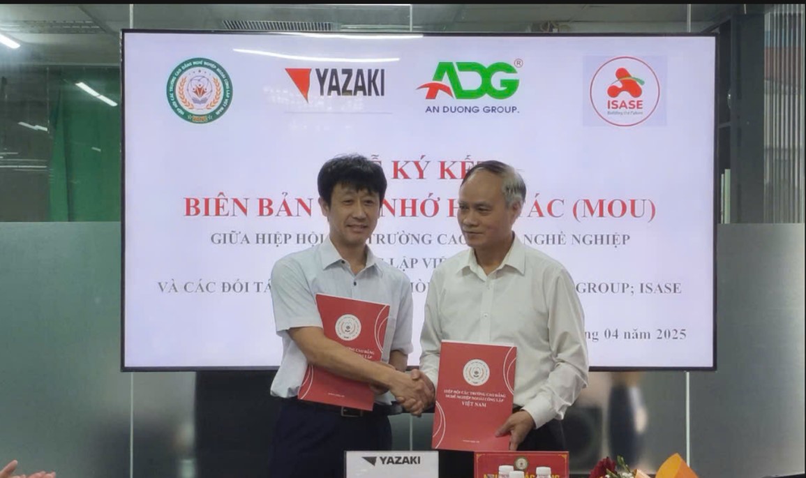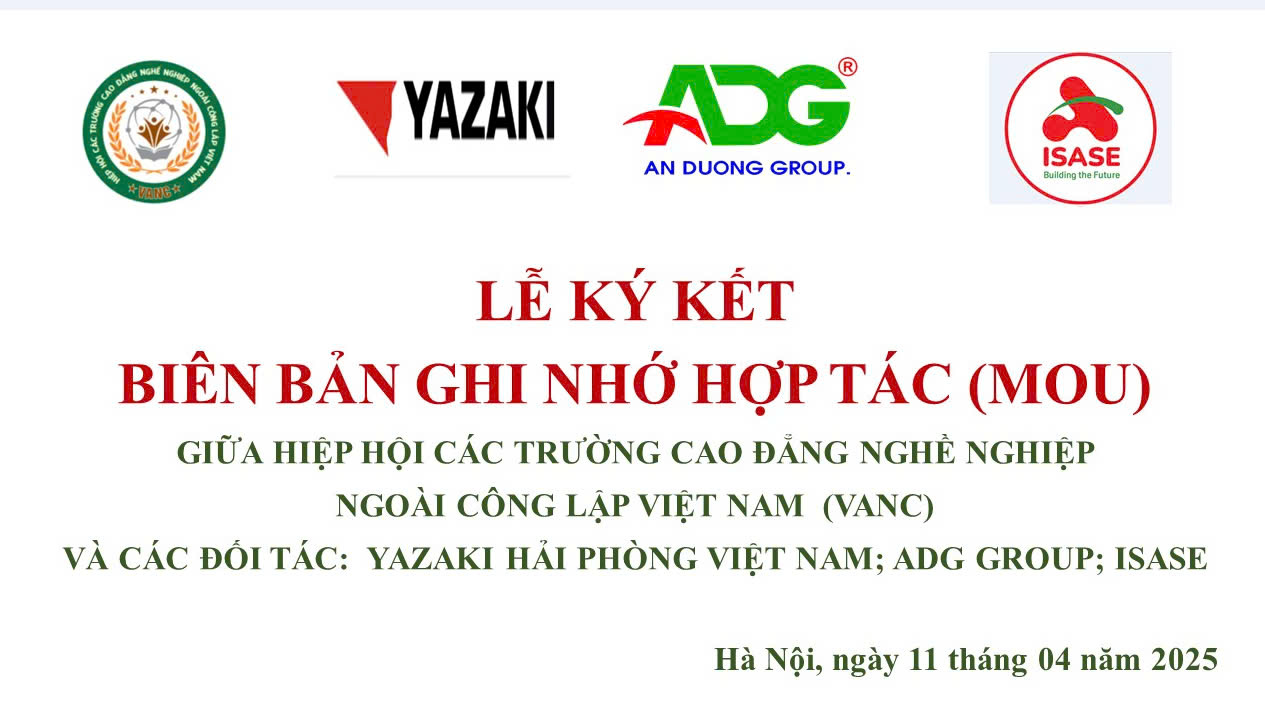 Ngày 11.4.2025 Hiệp hội Các trường cao đẳng nghề nghiệp ngoài công lập Việt Nam tổ chức lễ công bố Quyết định thành lập Ban hợp tác Doanh nghiệp (BCB) và ký kết Biên bản ghi nhớ hợp tác (MOU) với các đối tác: Tập đoàn An Dương (ADG), Viện Khoa học và Giáo dục Đông Nam Á (ISASE), Công ty YAZAKI Hải Phòng Việt Nam (Doanh nghiệp FDI 100% vốn của Nhật Bản).