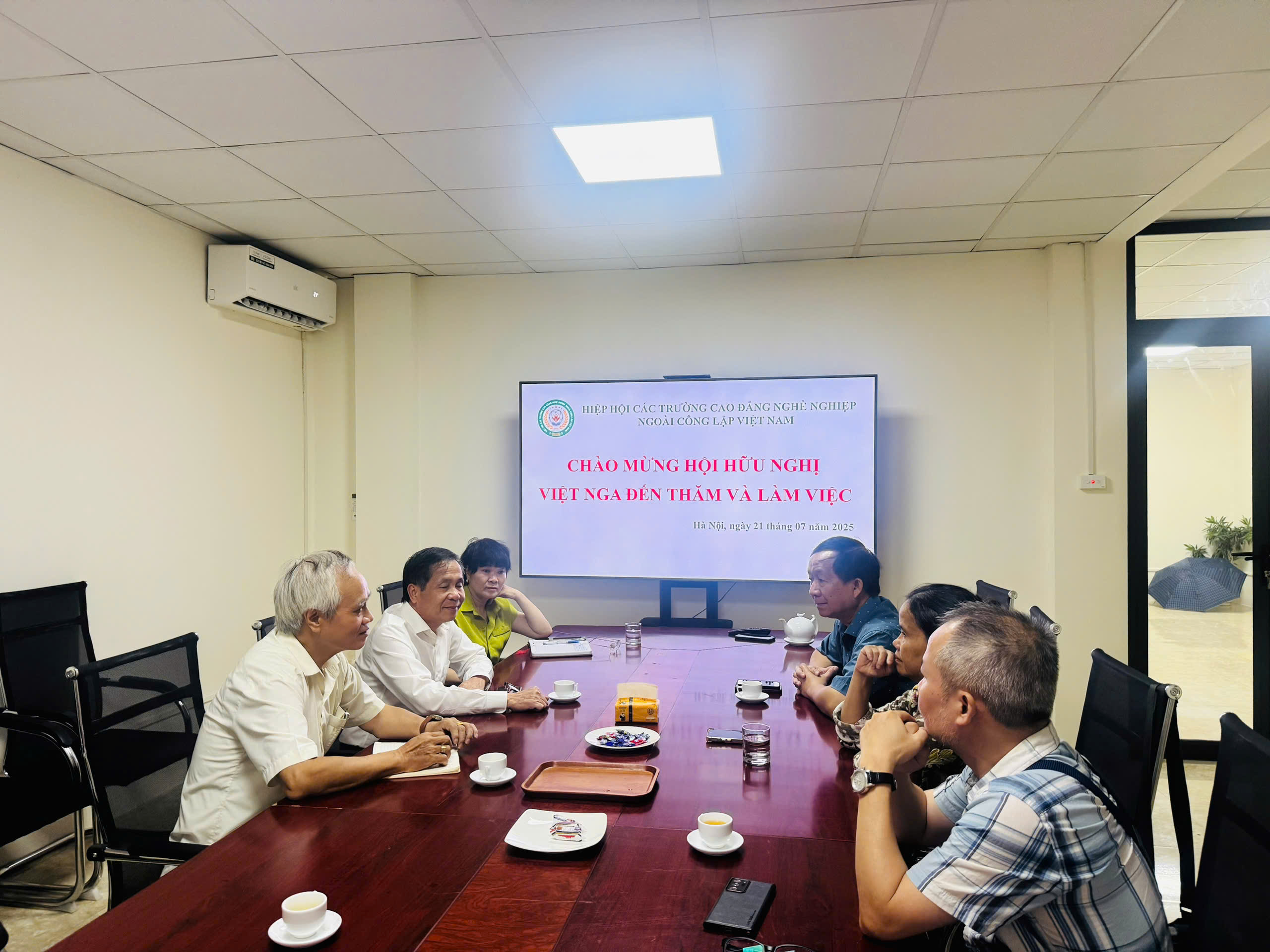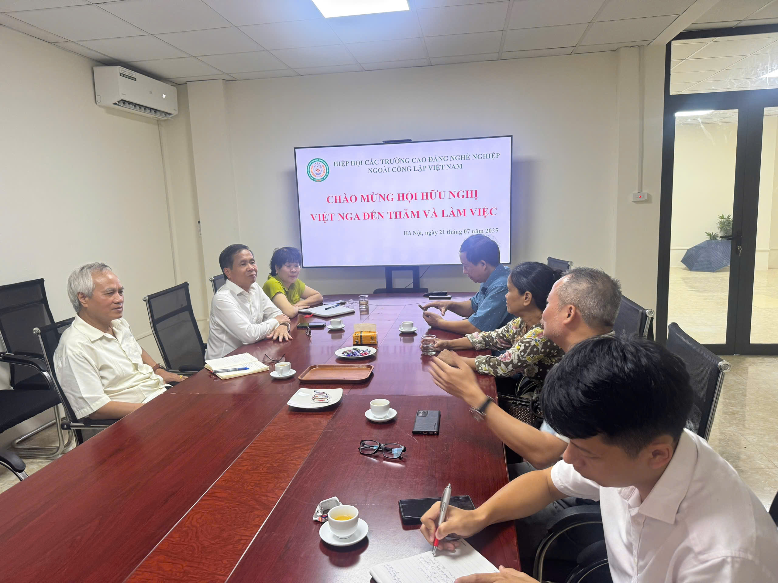 Sáng ngày 21/7/2025, tại Văn phòng Hiệp hội Các trường cao đẳng nghề nghiệp ngoài công lập Việt Nam, buổi làm việc giữa Hiệp hội và các đối tác chiến lược đã diễn ra thành công, mở ra nhiều cơ hội hợp tác trong lĩnh vực đào tạo, phát triển nguồn nhân lực và kết nối quốc tế, đặc biệt là với Liên bang Nga.